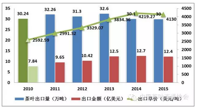 圖9 2010-2015年我國茶葉出口量、總金額、單價(jià)走勢變化